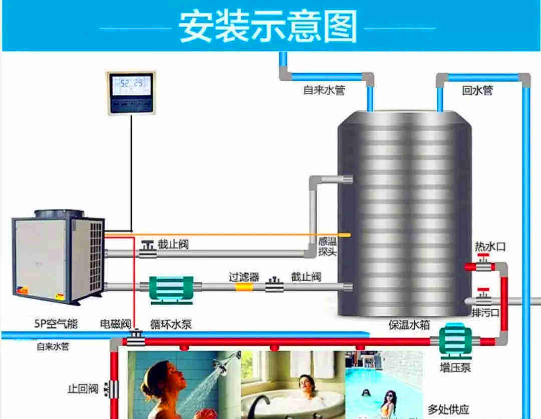 在標況下系統(tǒng)設(shè)計為自來水流經(jīng)機組一次升溫5℃。將保溫水箱中的水循環(huán)加熱至設(shè)定溫度。系統(tǒng)設(shè)計簡單,在天氣比較寒冷區(qū)域,機組能穩(wěn)定運行。